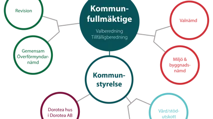 Kommunen styrs av folkvalda politiker, kommunfullmäktige är högsta beslutande instans. I kommunen finns också nämnder, utskott, enheter och bolag. Varje nämnd har en förvaltning med tjänstepersoner som ska verkställa nämndernas beslut.