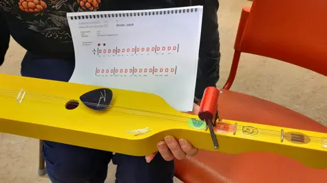"Det blir lättare att spela eftersom man inte behöver tänka på vilka fingrar man ska använda till ackorden. Man behöver bara dra bygeln åt rätt håll", säger Agneta Backlund, musiklärare på Strandenskolan.